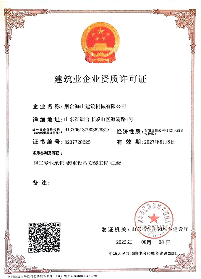 2022年度海山機械的建筑業(yè)企業(yè)資質(zhì)許可證書,以及特種設(shè)備生產(chǎn)許可證書均通過審批,具體如下圖: